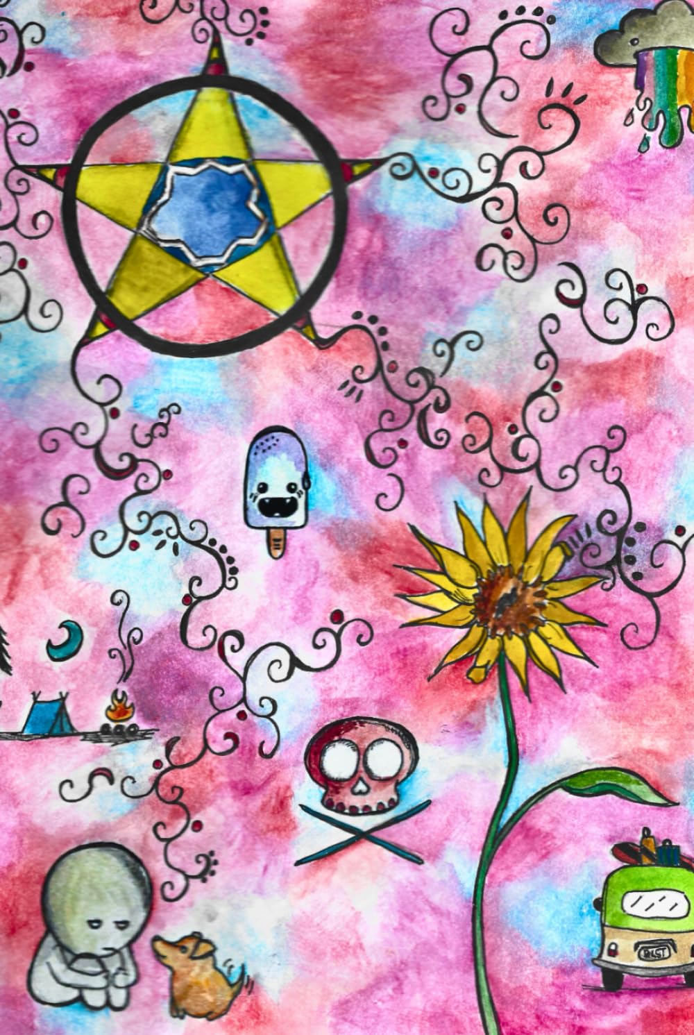 The cover is a playful and bright print of water color and hand-drawn ink artwork, containing a large pentagram (a protective symbol) and several playful composite drawings.